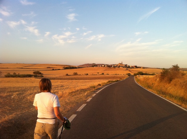 Treinta y cinco grados a la sombra… Es posible que exista más calor, pero ahora mismo no lo concibo. Menos mal que la mañana nos ha respetado, y el sol no ha empezado a apretar en serio hasta un rato después de haber llegado. Y eso que nos hemos dormido; la intención era hacer diana a las cinco, pero no nos hemos despertado hasta una hora más tarde,sudados como pollos tras una noche caliente, caliente. Había que acelerar, así que nos hemos lavado la cara, una frura para desayunar y al camino. Como decía, el calor nos ha respetado, y el suave viento nos ha permitido avanzar a buen paso por las ondulaciones del terreno. Como anécdota quedan el encuentro con un andaluz jubilado y parlanchín, residente en Los Arcos, operado de un cancer de colon y con dos infartos, que continúa andando y haciendo los caminos de Santiago en cuanto puede. De lo que no parece que quiera curarse es de una verborragia compulsiva que acabará con él, seguro 🙂