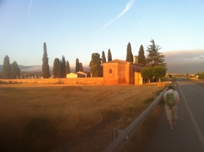 El sol todavía no ha despuntado cuando dejamos a la espalda el casco antiguo de Navarrete, y sopla un viento fresco que si no fuéramos vascos llamaríamos frío. Al poco pasamos junto al cementerio, justo con los primeros rayos, donde podemos ver la portada románica del hospital de San Juan de Acre, rescatada de la demolición del antiguo edificio en el s.XIX. El cielo está casi desppejado, pero al oeste las nubes gris plomo hacen un efecto de iluminación dramática de lo más amenazador. ¿Y si resulta que el tiempo se tuerce? Bueno, no importa, después de todo alguna ventaja tiene que tener cargar con la mochila, donde llevamos las capas de lluvia.