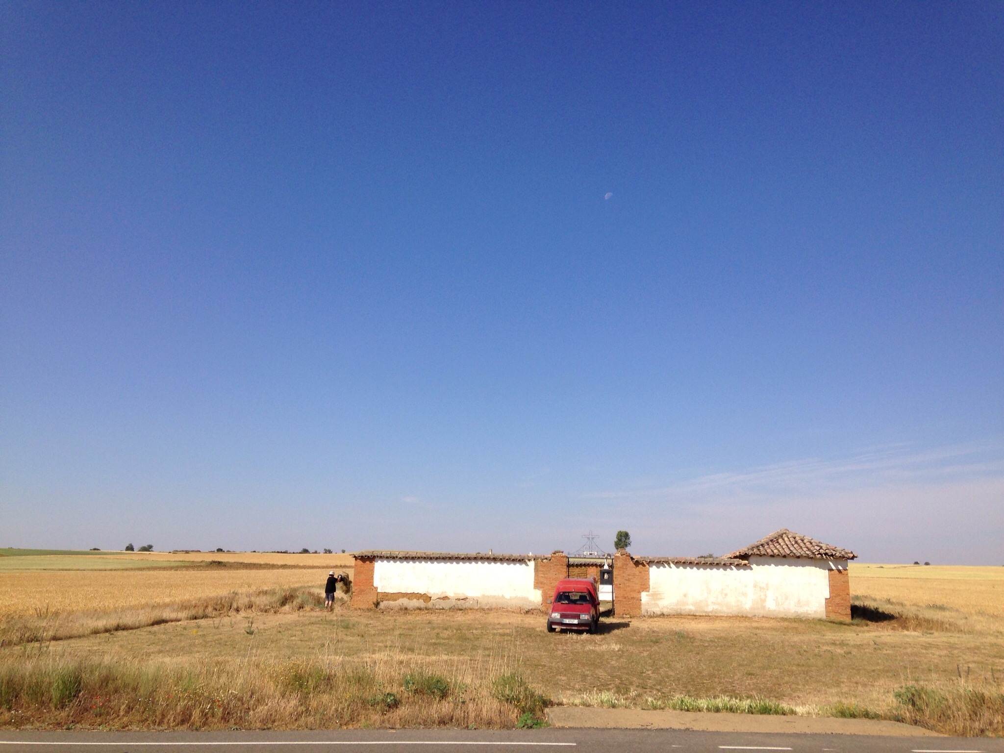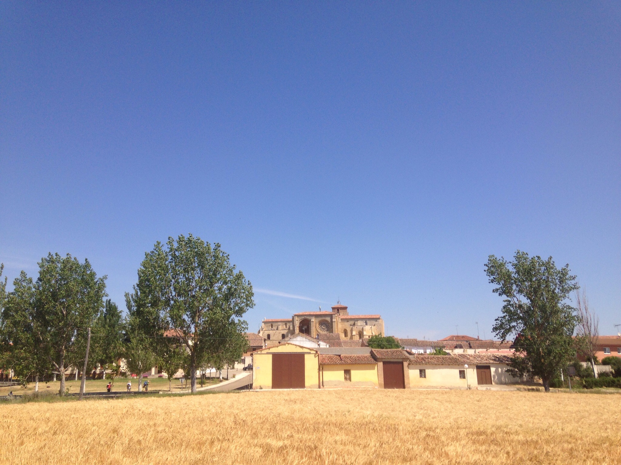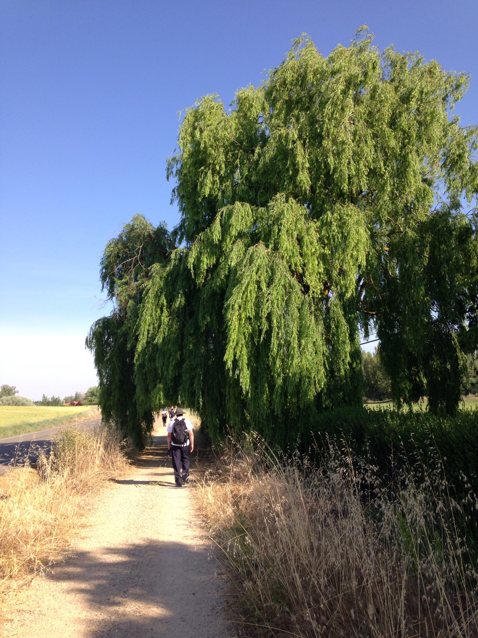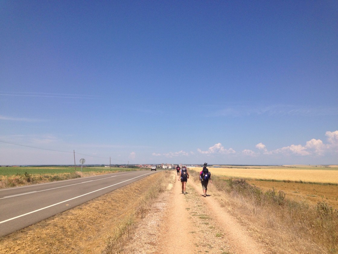 El trayecto transcurre sin novedades por un andadero paralelo a la carretera. Paisaje ondulado, campos de cereal en distintos grados de maduración, con una rica gama de tonos que va del verde al dorado y al ocre de la tierra arcillosa. Rectas interminables puntuadas frecuentemente por peregrinos de todas las razas y procedencias. Sol. Calor. Lo dicho, sin novedades.