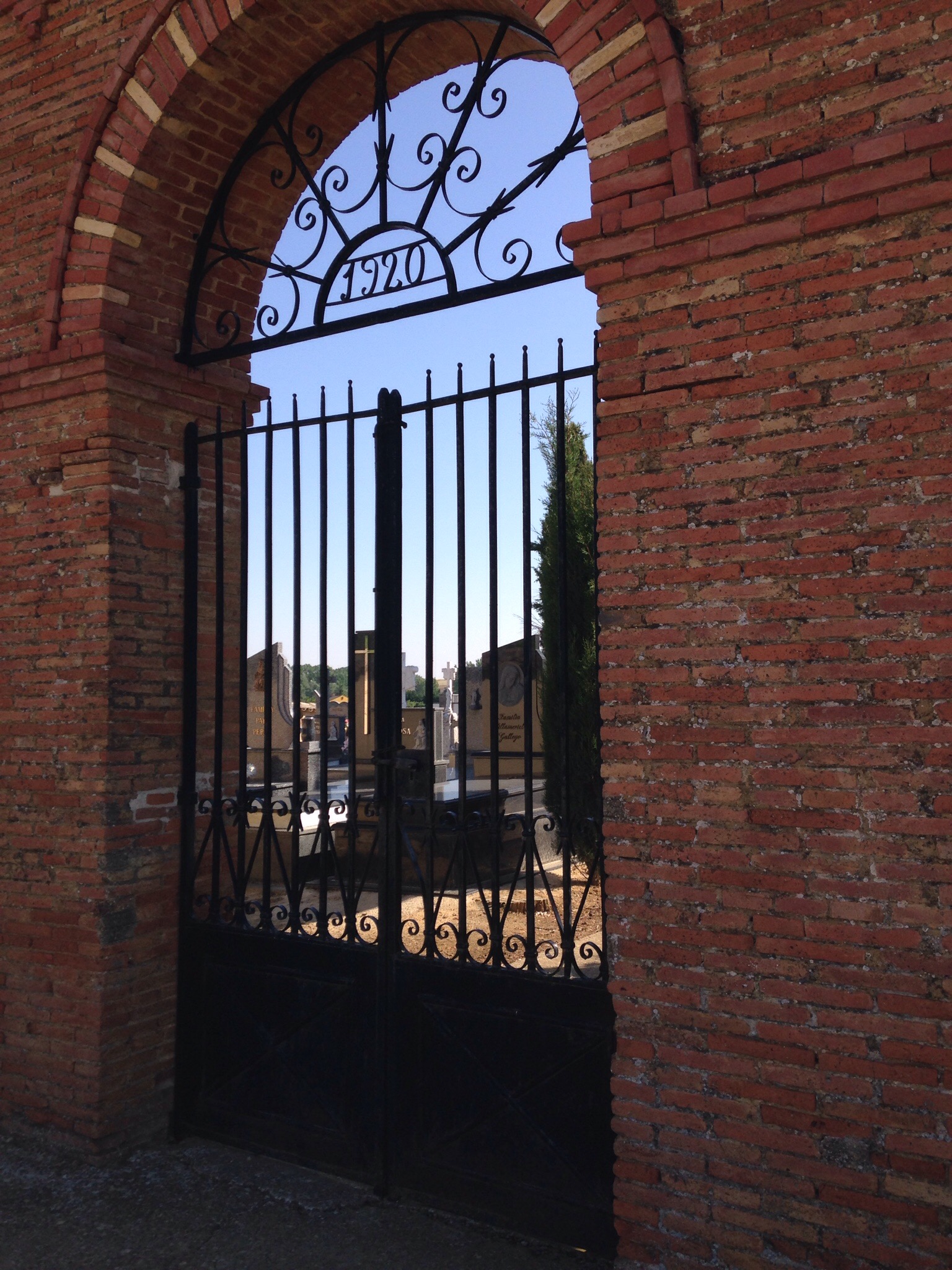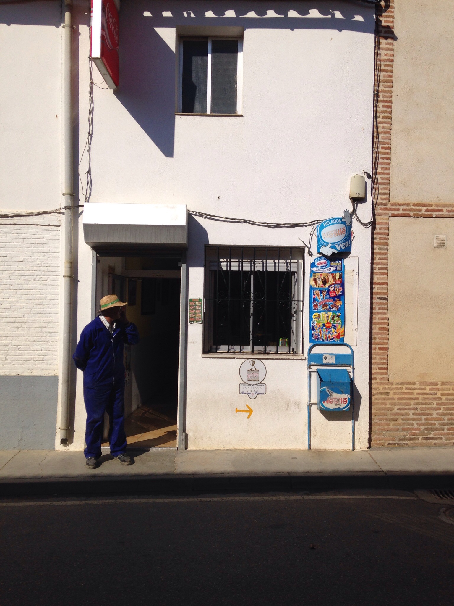 Apenas hay más gente en los pueblos que los peregrinos que pasan. Así que al pasar junto a un bar le «robo» un retrato a un indígena. No parece importarle. Hago también un par de fotos de cementerios, para la colección de Brita. Y en Villarmenteros, más o menos a mitad de camino, hago un alto en un área de descanso para peregrinos, equipada con fuente, mesas de piedra y alfombra de césped. Un lujo.